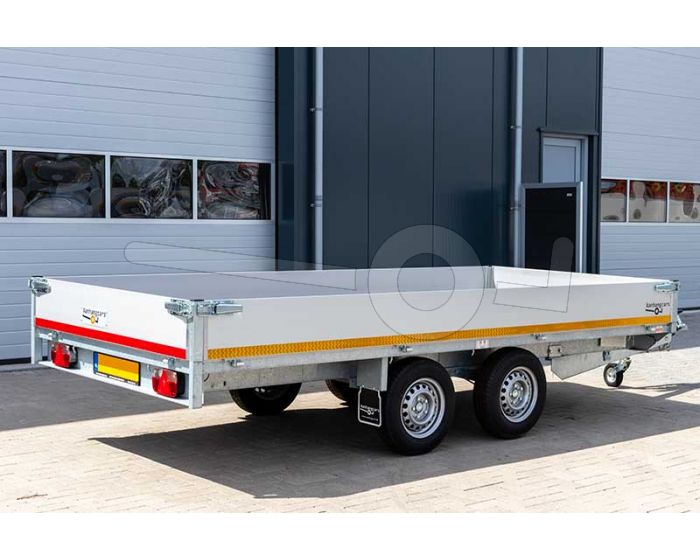 Lxb 356x200cm, Bruto 2500kg (1866kg netto), Lvh 72cm, Alu borden 40cm, Tandemas geremd, Banden 165R13, Met oprijplaten en lier.